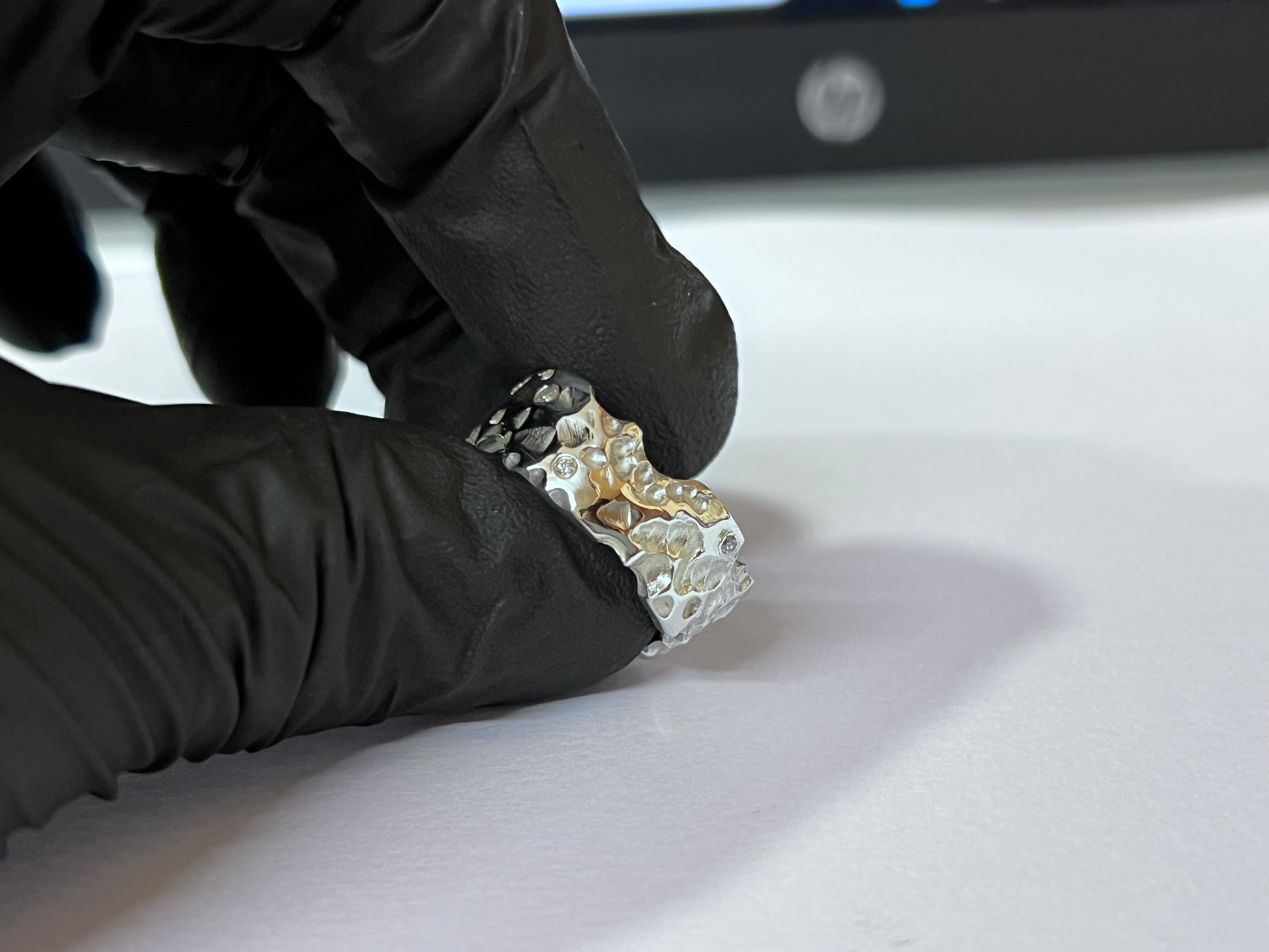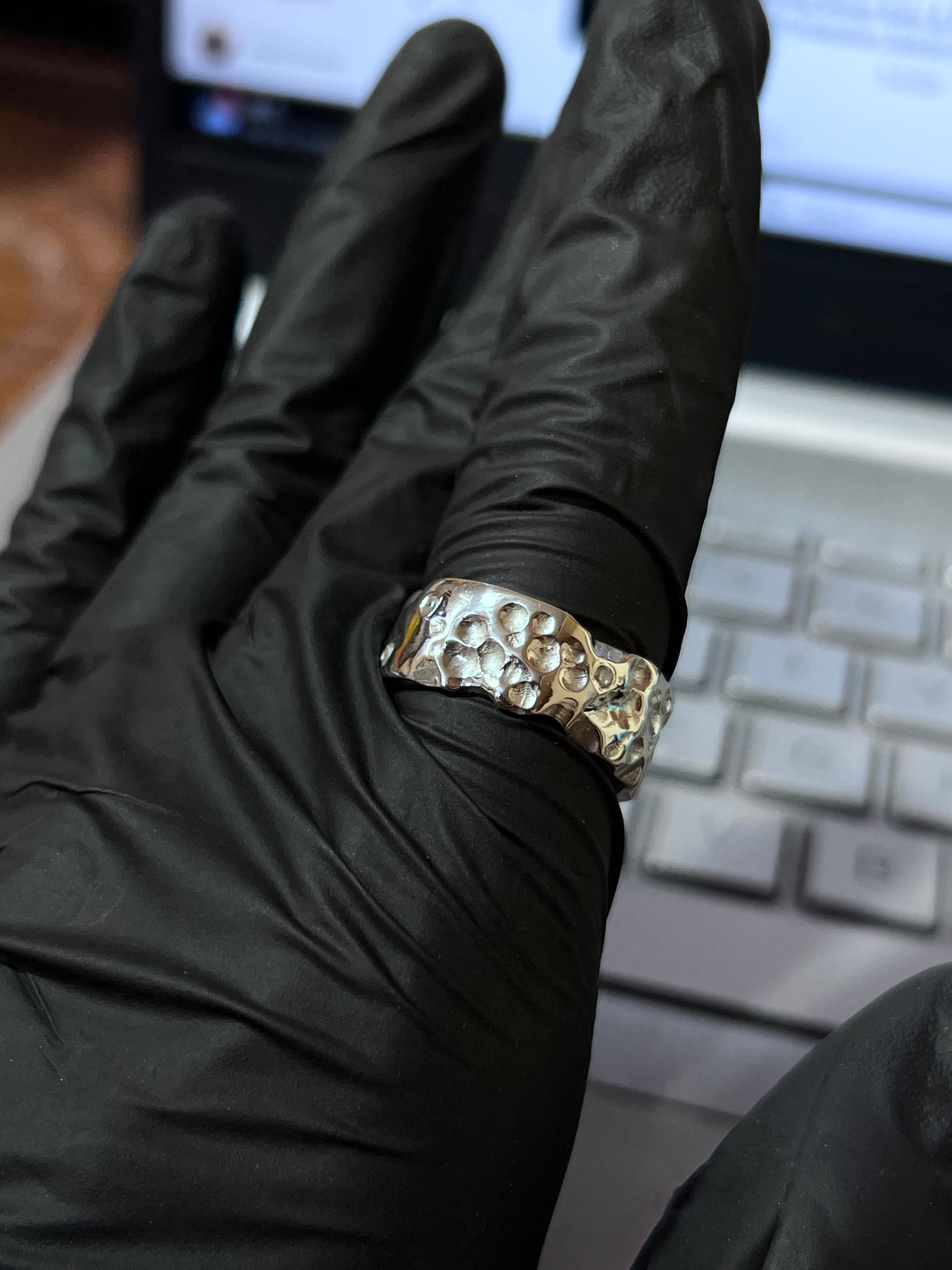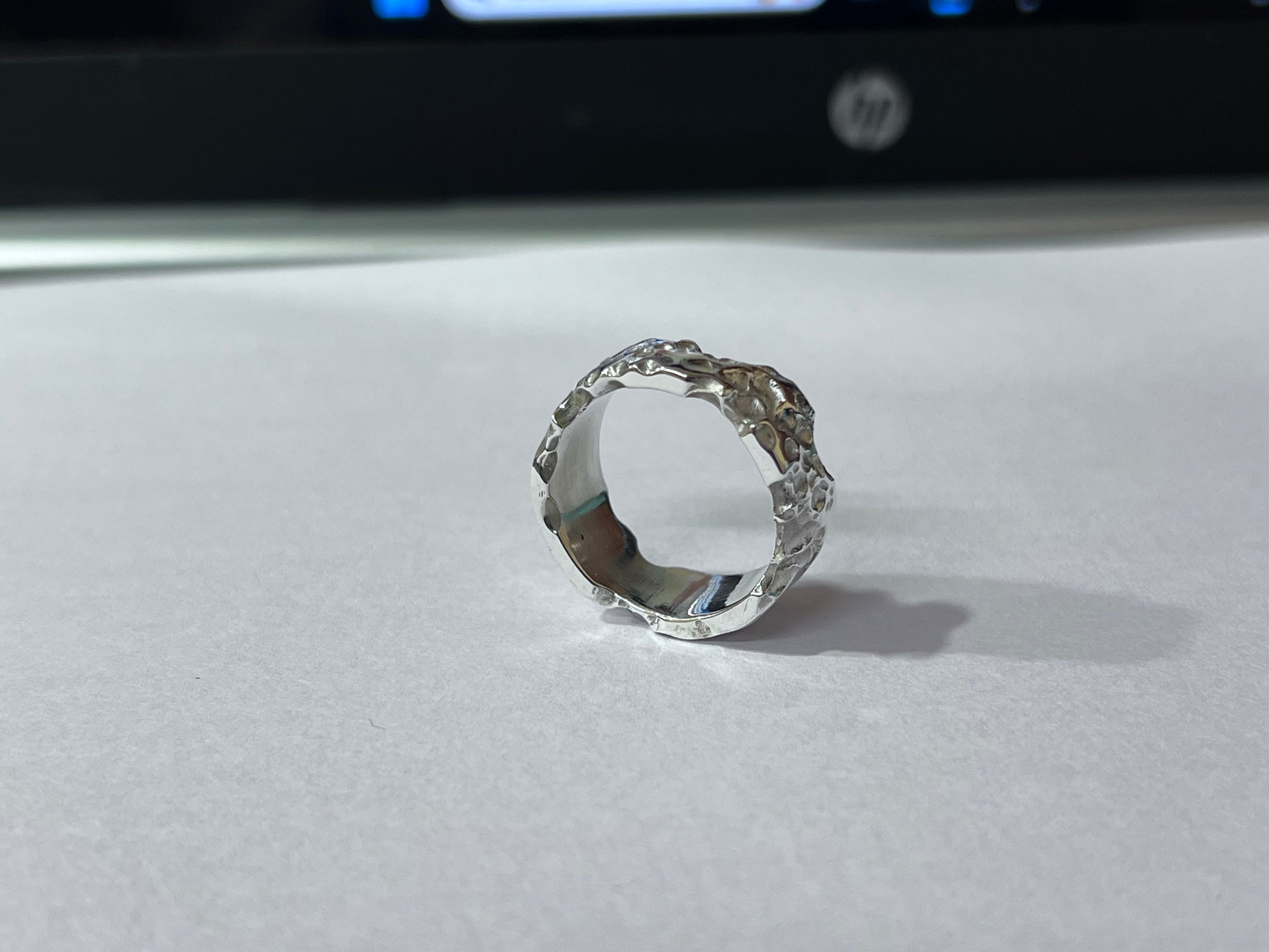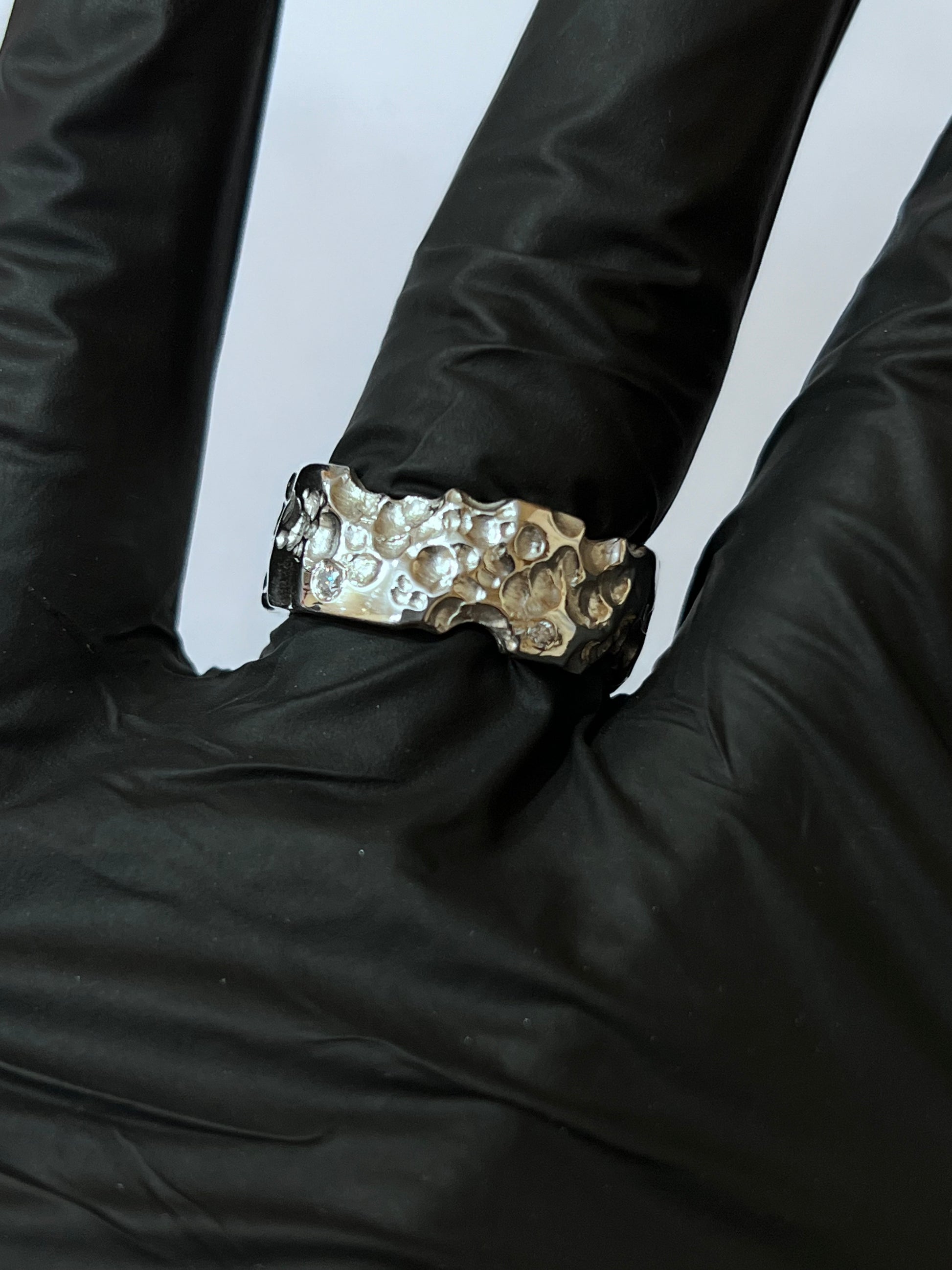 This unique ring is meticulously designed and cast in 925 sterling silver, featuring a bold, organic texture with a random hammered-style pattern. Subtle sparkling stones are set within the design, adding an elegant touch that contrasts beautifully against the rugged silver surface. Its irregular edges and artisanal finish make it a one-of-a-kind statement piece — perfect for those who appreciate individuality and craftsmanship in their jewelry.
